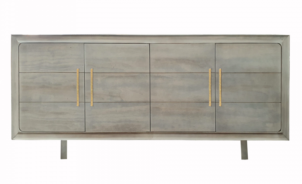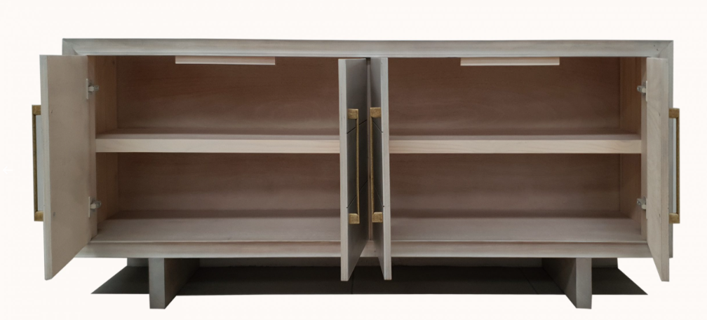 Made of solid pine wood in white cloud color, in acrylic paint, with wooden doors, brass color pulls, has a fixed shelf inside the cabinet and slotted back for electronic devices.