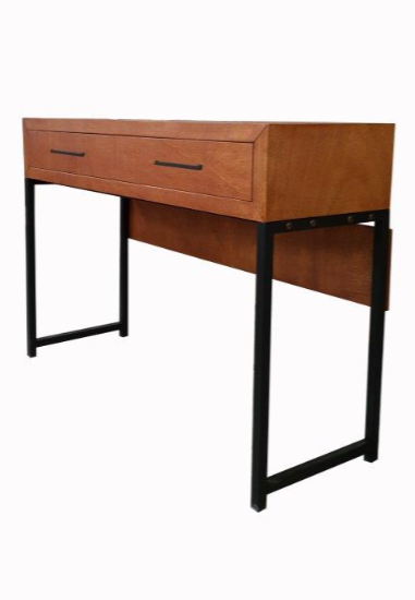 Made of okume veneer in cinnamon color, has 2 large drawers for storage and has metal extension slides and puller in black color!