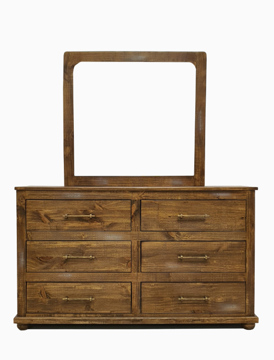 The Olathe bedroom, made of pine wood, in 9 coat acrylic finish in beige color, with brass colored metal extension pull handle!