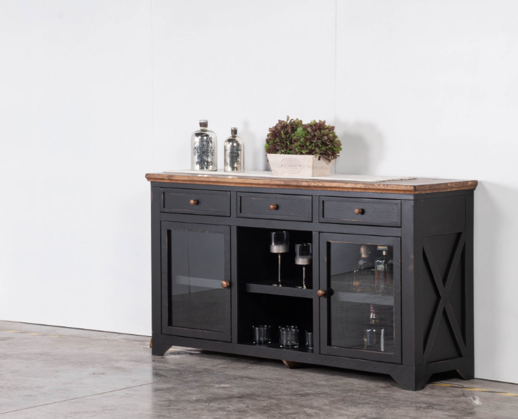 Crafted from solid pine wood, the Qatar Dining Set features a stylish two-tone acrylic finish and okume veneers. The chairs offer ergonomically designed wooden seats for comfort, while the table legs are easy to join and assemble. The server includes a central shelf, drawers with smooth metal runners, and sleek black metal handles, combining functionality with elegant design.