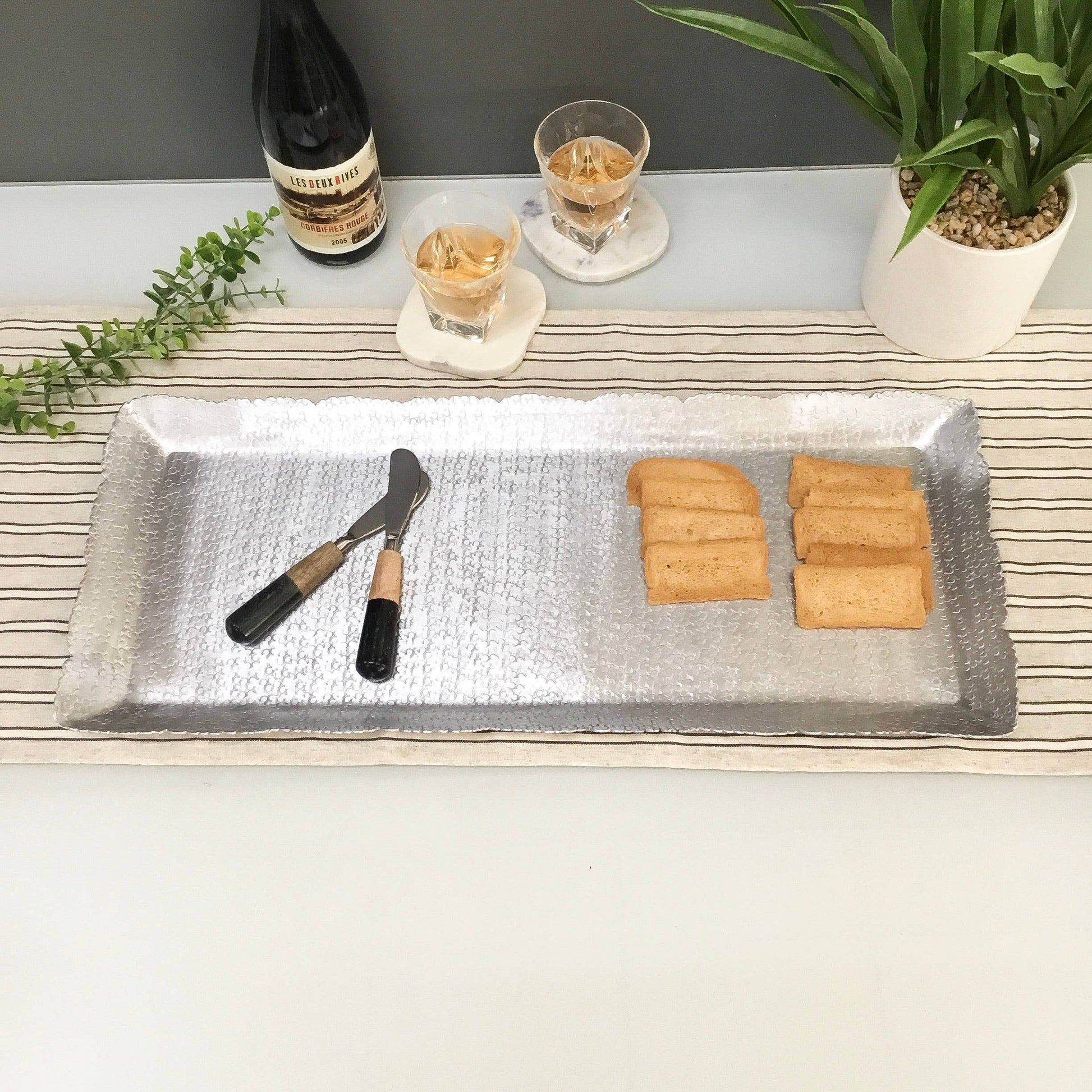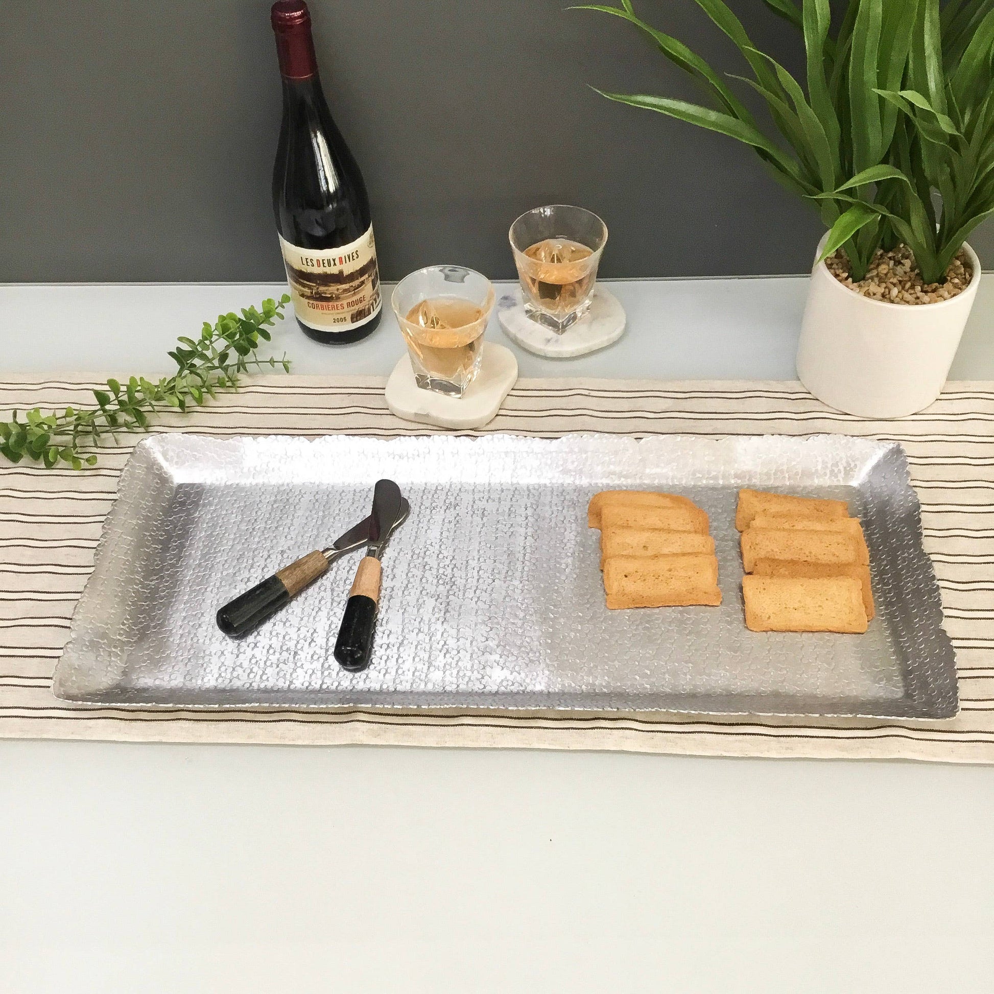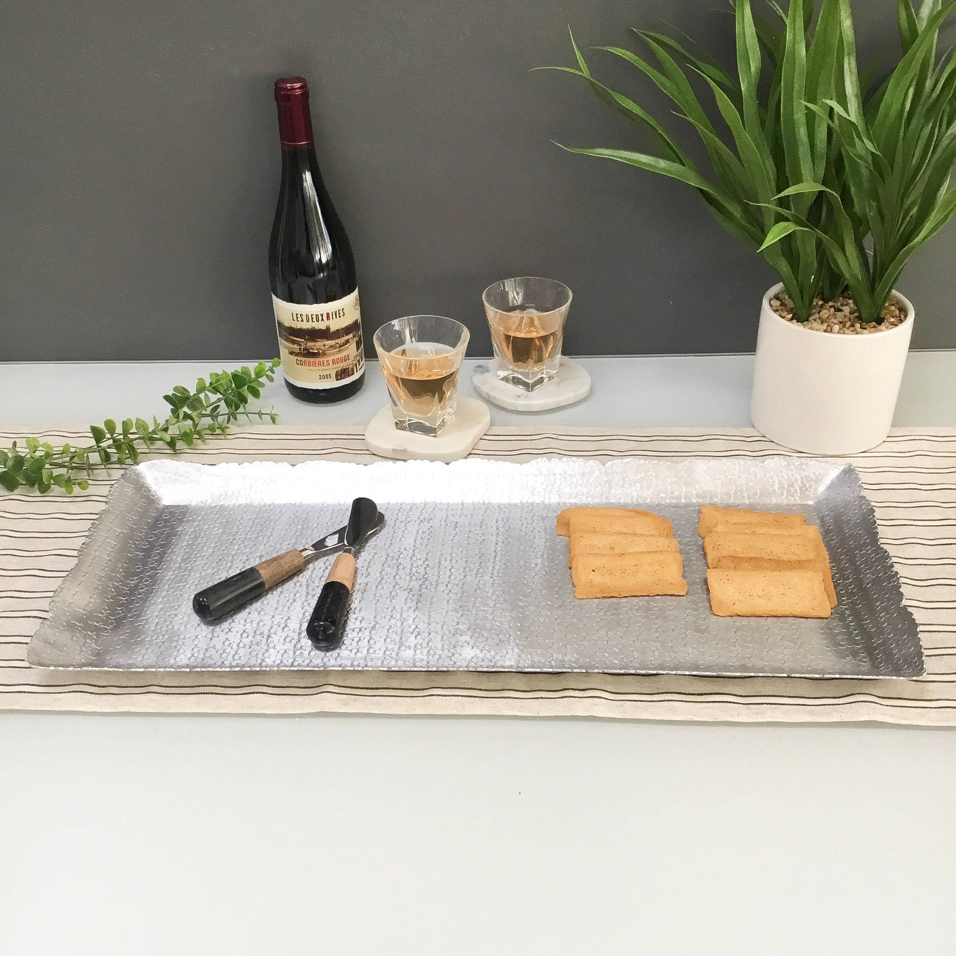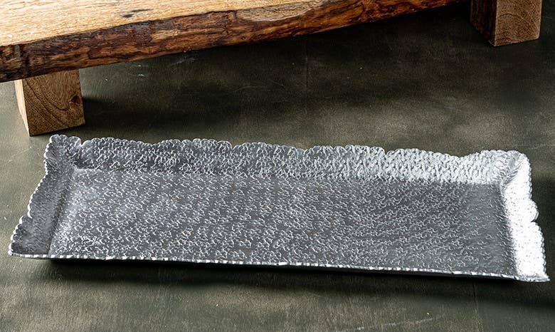 The Silver Aluminum Rectangle Hammered Cutting Tray is a versatile and stylish addition to any home. Crafted from high-quality silver aluminum, this tray features a unique hammered texture that adds a touch of elegance to your servingware collection. With its rectangular shape, it is perfect for serving a variety of dishes, from appetizers to desserts. The sturdy construction ensures durability and longevity, making it suitable for both everyday use and special occasions. Whether you are hosting a dinner party or simply enjoying a meal with your family, this tray is a must-have for any home. Upgrade your serverware collection with the Silver Aluminum Rectangle Hammered Cutting Tray and impress your guests with its sleek design and functionality.